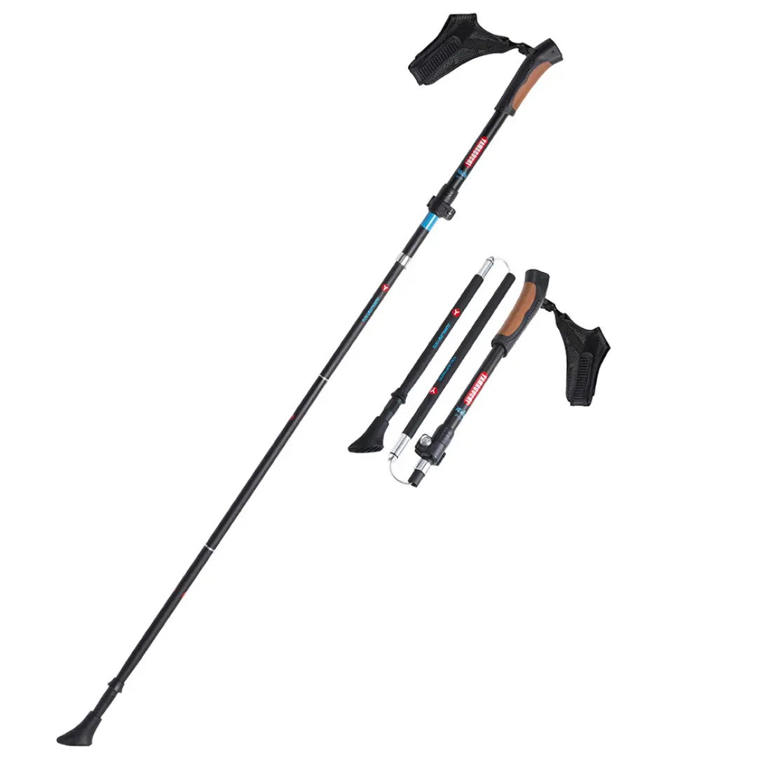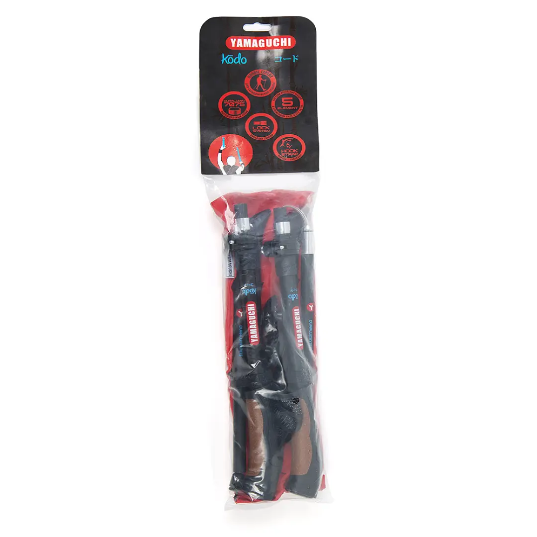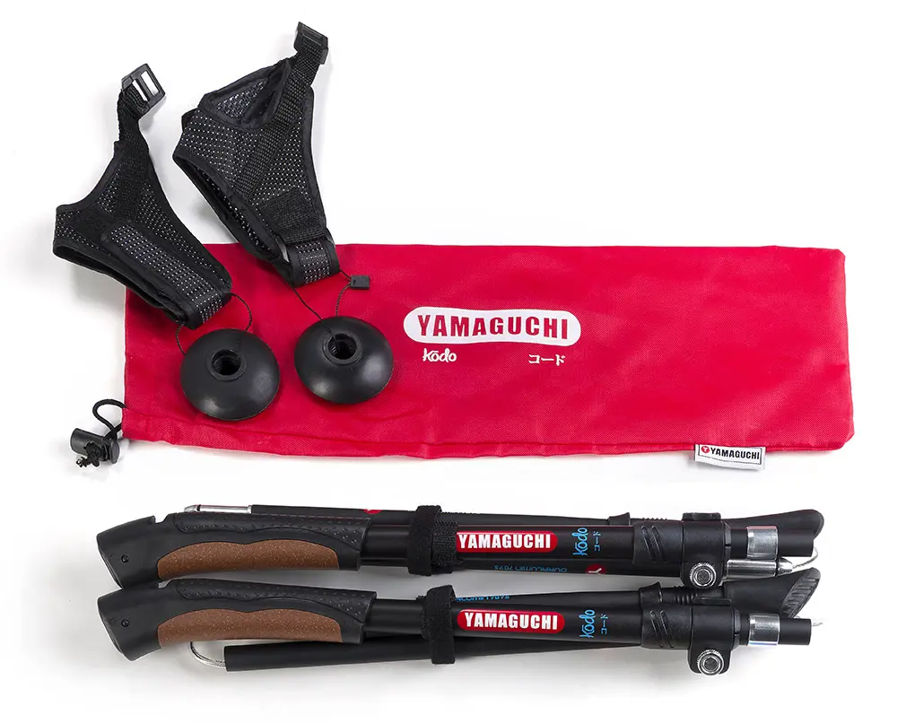 Yamaguchi Kodo имеют регулируемую конструкцию. Их можно использовать людям с ростом от 160 до 195 см. За счет трехсекционной телескопической конструкции и нанесенной сантиметровой шкалы на корпус их просто отрегулировать, установить необходимую высоту. Рукоятка изготавливается из армированного пластика, есть два съемных наконечника, по кисти регулируется за счет ремешка «капкан» - скандинавский темляк.