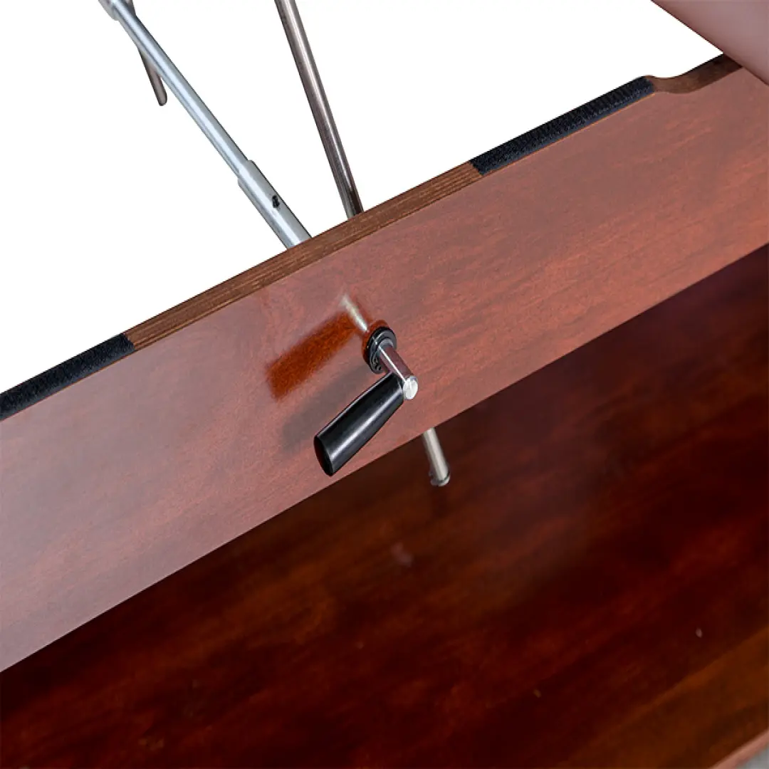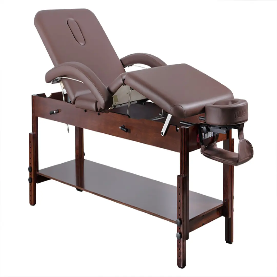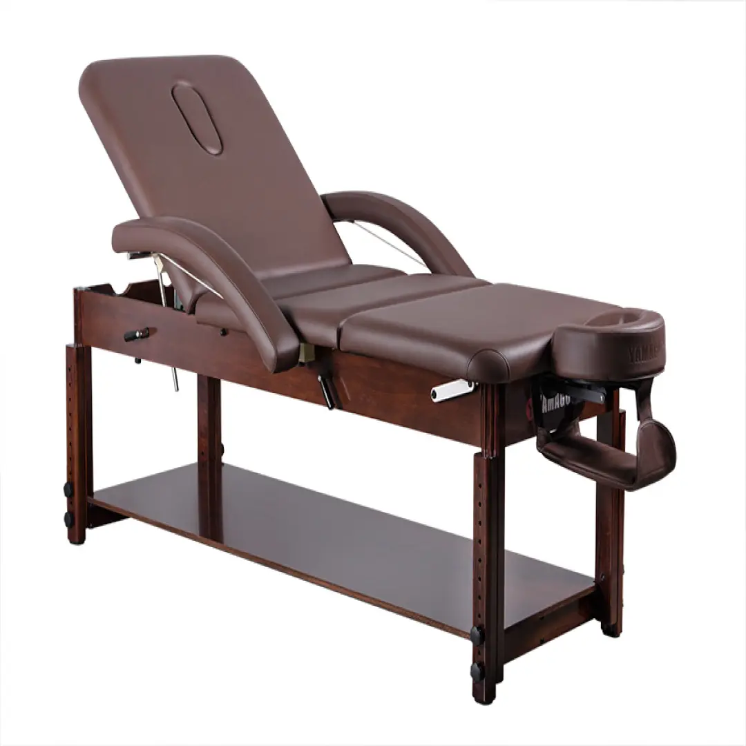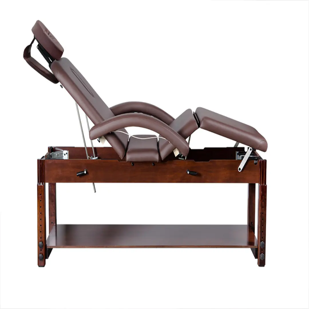 Его конструкция сейчас является более продуманной до мелких элементов, что способствует наличию еще большей прочности, функциональности и долговечности. Благодаря каркасу, который был произведен из экологически чистого бука, и наличию благородного шоколадного цвета, стол в любом массажном кабинете будет занимать основную позицию.